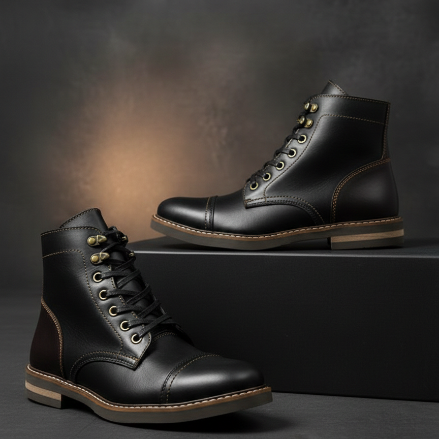 Estas botas combinan el diseño clásico en cuero negro con detalles en tono coñac para crear un look distintivo y moderno. Ideales para hombres que buscan un calzado resistente, cómodo y con personalidad para el día a día.